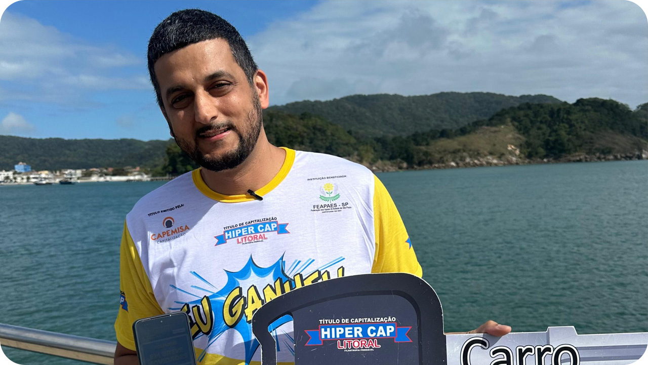 Willians D. Jesus, 36 anos, auxiliar de importação, foi o grande contemplado do quarto sorteio do Hiper Cap Litoral, levando para casa 130 mil reais. Morador de Santos, o sortudo adquiriu seu título pelo aplicativo e revelou que já foi sorteado no Giro da Sorte,anteriormente.